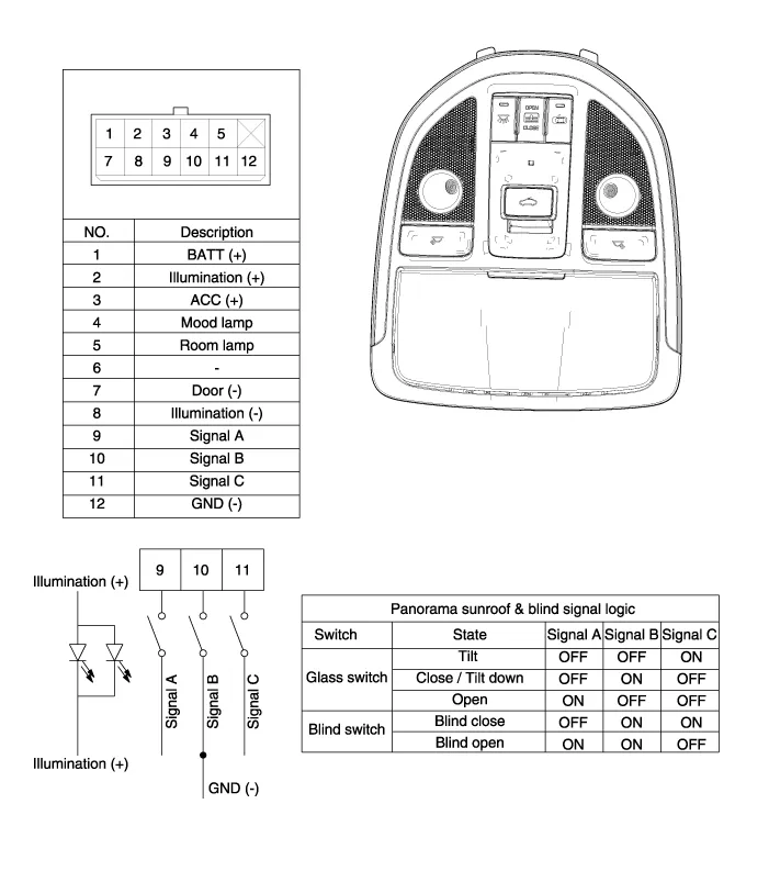 Circuit Diagram NO.Overhead console connector (10pin)Panorama sunroof motor (12pin)Roller blind motor (12pin)1GroundGround 1Battery (+)2-Glass status signal/ Parameter tool-3IGNGNDGround4Signal C switchLIN 1LIN 15Signal A switchLIN2LIN 26Battery (+)Signal B switch-7Glass status signal/ Parameter toolSignal C switch-8Vehicle speed signalSignal A switch-9---10Signal B switch--11?Vehicle speed signal-12IGNIGN