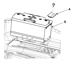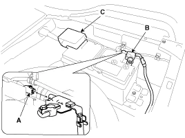 Disconnect the battery sensor connector (A), battery negative terminal (B) and positive terminal (C).