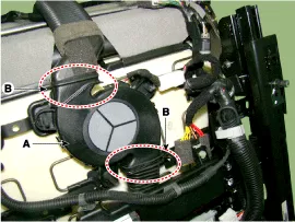 Remove the blower fan (A) after disengaging the retaining clips and mounting clip from the front seat cushion.