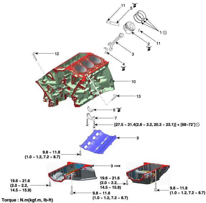 | 1. Piston ring 2. Piston 3. Connecting rod 4. Connecting rod upper bearing 5. Piston pin | 6. Connecting rod lower bearing 7. Connecting rod bearing cap 8. Baffle plate 9. Upper oil pan 10. Cylinder block | 11. Snap ring 12. Water jacket separator 1# 13. Water jacket separator 2# |