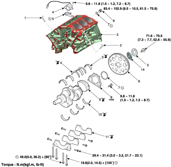 | 1. Plug bolt 2. Washer gasket 3. Crankshaft upper bearing 4. Thrust bearing 5. Adapter plate | 6. Drive plate 7. Rear oil seal 8. Rear oil seal case 9. Crankshaft 10. Crankshaft lower bearing | 11. Main bearing cap 12. Oil cover 13. Oil cover gasket 14. Crankshaft adapter |