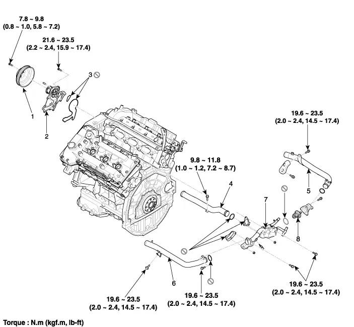 | 1. Water pump pulley 2. Water pump 3. Water pump gasket 4. Water center pipe | 5. Water inlet pipe 6. Water outlet pipe 7. Water temperature control assembly 8. Thermostat |