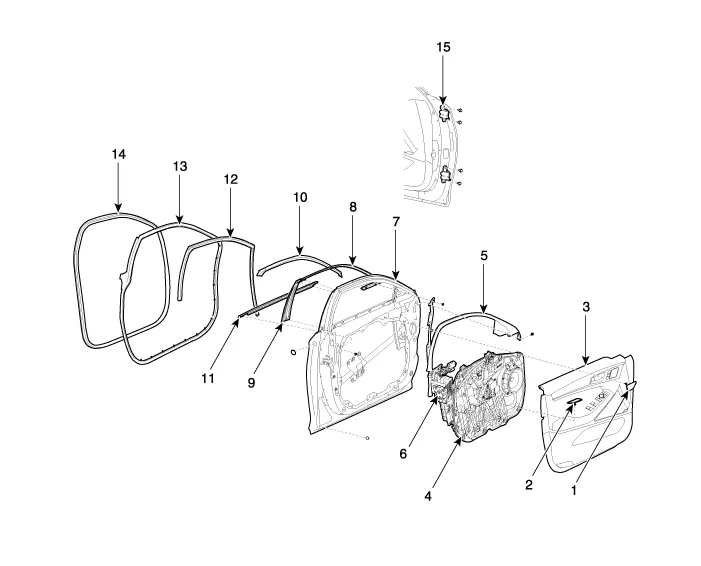 | 1. Front door inside handle cap 2. Front door pull cap 3. Front door trim 4. Front door module 5. Front door frame inner cover 6. Front door latch assembly 7. Front door panel 8. Front door frame molding | 9. Front door frame garnish 10. Front door upper open weatherstrip 11. Front door belt outside weatherstrip 12. Front door windshield glass run assembly 13. Front door side weatherstrip 14. Front door body side weatherstrip 15. Front door hinge |
