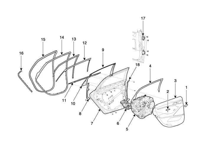 | 1. Rear door inside handle cap 2. Rear door pull cap 3. Rear door trim 4. Rear door frame inner cover 5. Rear door module 6. Rear door latch assembly 7. Rear door panel 8. Rear door channel 9. Rear door frame moulding | 10. Rear door frame garnish 11. Rear door belt outside weatherstrip 12. Rear door upper open weatherstrip 13. Rear door windshield glass run assembly 14. Rear door side weatherstrip 15. Rear door body side weatherstrip 16. Rear door parting weatherstrip 17. Rear door hinge 18. Rear door front parting weather strip |
