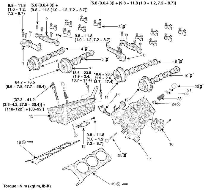 | 1. RH intake camshaft OCV 2. Camshaft thrust bearing cap 3. Camshaft bearing cap 4. RH exhaust camshaft 5. RH intake camshaft 6. RH exhaust camshaft CVVT assembly 7. RH intake camshaft CVVT assembly 8. LH exhaust camshaft OCV 9. LH intake camshaft | 10. LH exhaust camshaft 11. LH intake camshaft CVVT assembly 12. LH exhaust camshaft CVVT assembly 13. RH exhaust camshaft OCV 14. LH intake camshaft OCV 15. RH cylinder head 16. Fuel pump bracket 17. LH cylinder head | 18. RH cylinder head gasket 19. LH cylinder head gasket 20. MLA 21. Retainer lock 22. Retainer 23. Valve spring 24. Valve stem seal 25. Valve |