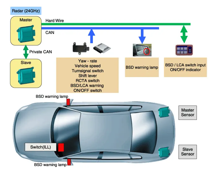 BSD is a system that measures the speed of and distance from the following vehicles by using two magnetic wave radar sensors attached to the rear bumper, and detects any vehicle within the blind spot zone and gives off alarm (visual and auditory).