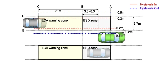 Lane Change Assist (LCA) : Senses other vehicles approaching at high speed in the BSD zone and turns on the BSD warning lamp for the driver.