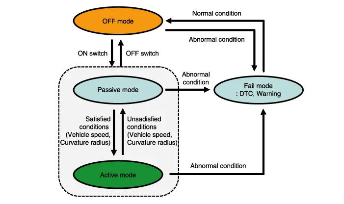 If the activation conditions (speed and curvature radius) are not met while driving, Passive mode is on (warning removed).