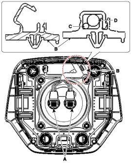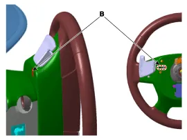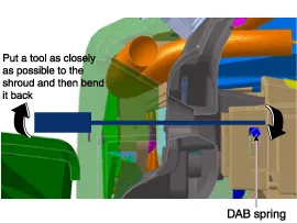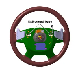 Turn a steering wheel clockwise. Put a tool into a hole(B) and bend back a fixed DAB spring. Make sure to pull DAB cover when