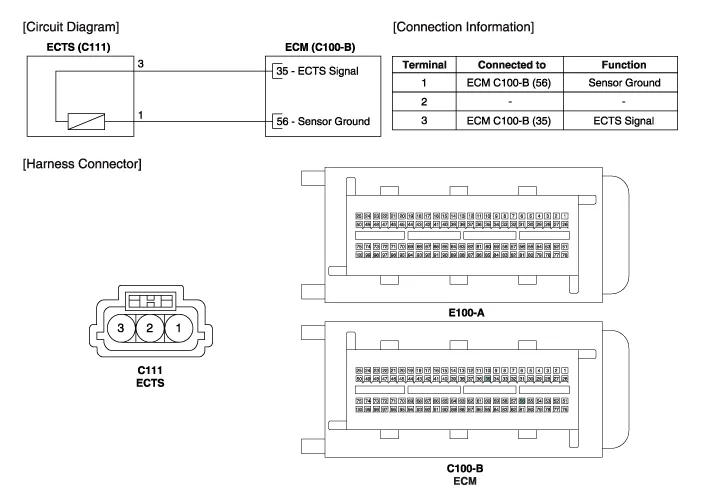 Inspection 1. Turn the ignition switch OFF. 2. Disconnect the ECTS connector. 3. Remove the ECTS (Refer to "Removal"). 4. After immersing the thermistor of the sensor into engine coolant, measure resistance between the ECTS terminals 3 and 4.