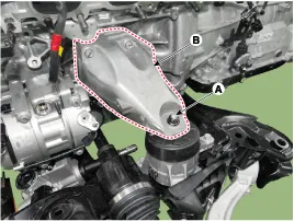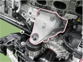 Remove the upper nut (A) of the LH engine mounting insulator, and then remove the mounting support bracket (B).