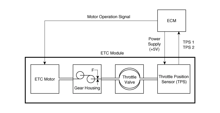 The Electronic Throttle Control (ETC) System consists of a throttle body with an integrated control motor and throttle position sensor (TPS). Instead of the traditional throttle cable, an Accelerator Position Sensor (APS) is used to receive driver input. The ECM uses the APS signal to calculate the target throttle angle; the position of the throttle is then adjusted via ECM control of the ETC motor. The TPS signal is used to provide feedback regarding throttle position to the ECM. Using ETC, precise control over throttle position is possible; the need for external cruise control modules/cables is eliminated.