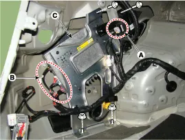 Remove the external amplifier (C) after disconnecting the connector (A),(B) and loosening the mounting nuts.