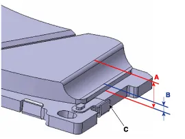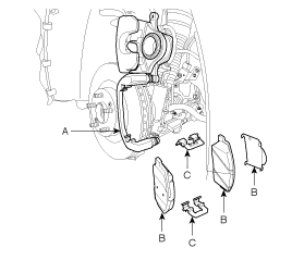 Remove pad shim (B), pad retainers (C) and brake pads (B) from the caliper bracket (A).