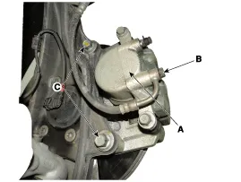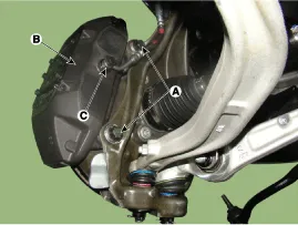 Loosen the hose eyebolt (B) and caliper mounting bolts (C), then remove the front caliper assembly (A).