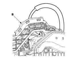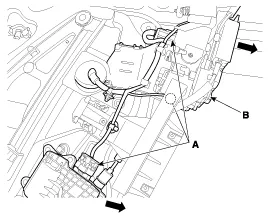 Remove the front door latch assembly (B) by pulling it in the direction of the arrow.