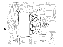 After loosening the mounting screws, remove the memory power seat unit (B).
