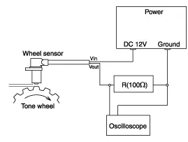 Compare the change of the output voltage of the wheel speed sensor to the normal change of the output voltage as shown below.