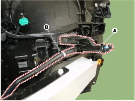 Remove the head lamp washer actuator (A) after loosening the mounting bolts and remove the hose (B).