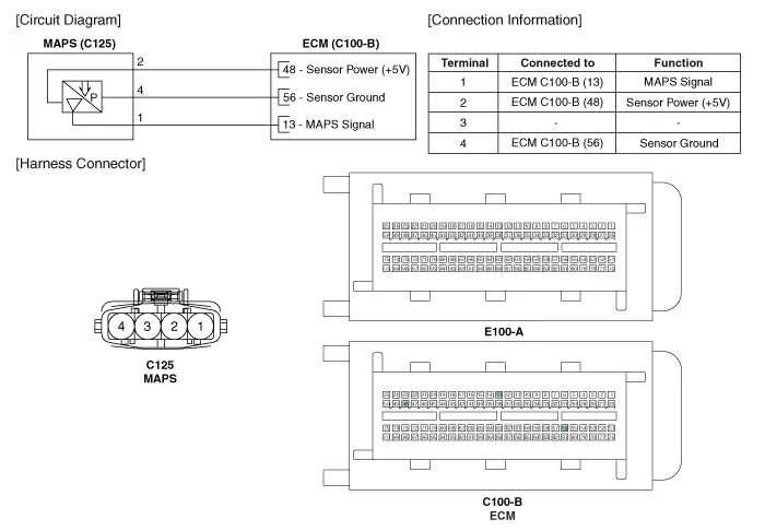 Inspection 1. Connect the GDS on the Data Link Connector (DLC). 2. Measure the output voltage of the MAPS at idle and with ignition ON. ConditionOutput Voltage (V)IG ONApprox.