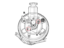 Remove the master cylinder (B) from the brake booster after loosening the mounting nuts (A).
