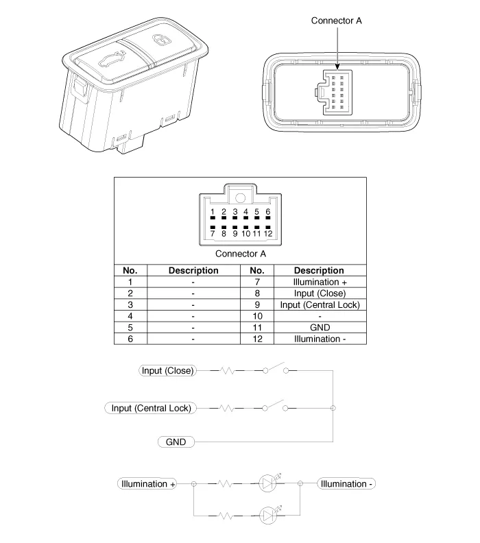 Inspection 1. Remove the trunk inner switch. 2. Check for continuity between terminals of the trunk inner switch. Removal 1. Disconnect the negative (-) battery terminal.