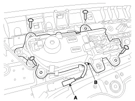 After loosening the mounting screws, remove the rear door inside handle (B).