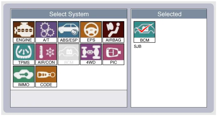 To diagnose the SJB function, select the vehicle model, BCM and SJB.