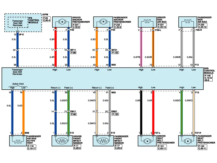 | 44 | Anchor pretensioner-Passenger-Low (-) | 44 | Seat belt buckle sensor-Front,Passenger |