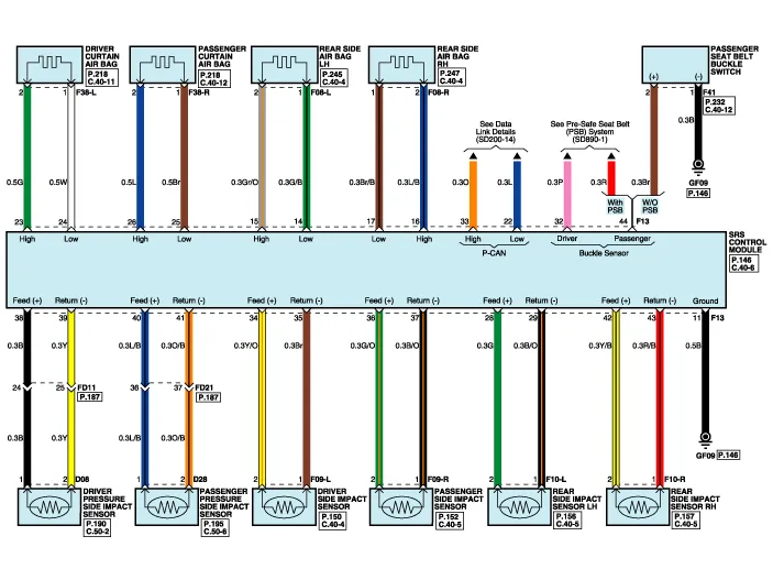 | 38 | Passenger SBR | 38 | Pressure side impact sensor-Driver-High (+) |