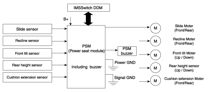 Description The optimal seat position set by the driver is memorized into the power seat unit by using IMS switch. In case of the position change, the seat can restore its preset position by IMS switch.