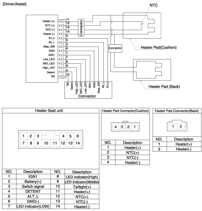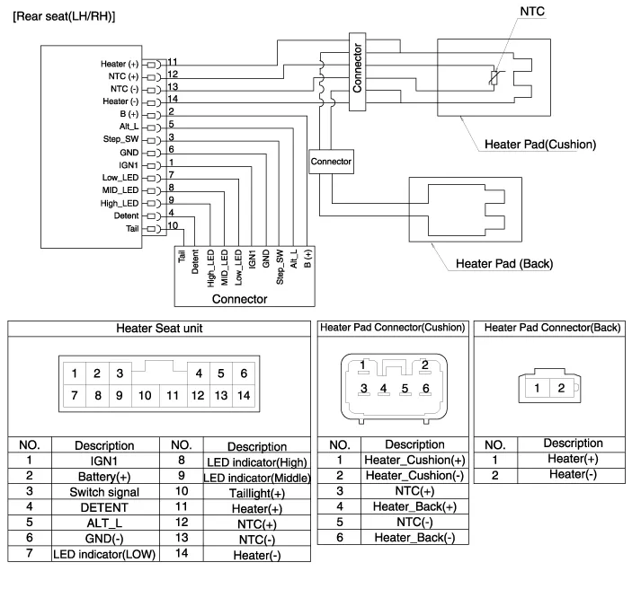 Inspection Front Seat Heater 1. Check for continuity and measure the resistance between terminals. Standard value (Fabric / Leather) Driver / Assists (cushion + back): 1.