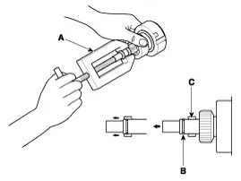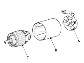 Remove the brush holder assembly (A), yoke (B) and armature (C).