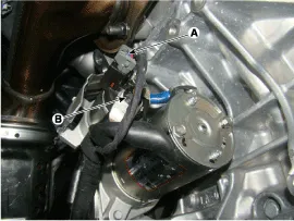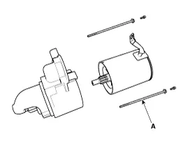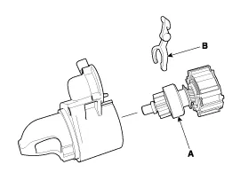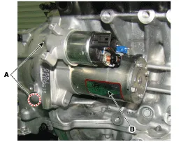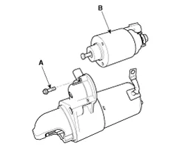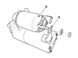 Remove the starter (B) after removing the mounting bolts (A).