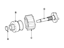 Disconnect the stop ring (A), overrunning clutch (B), internal gear (C) and planet shaft (D).