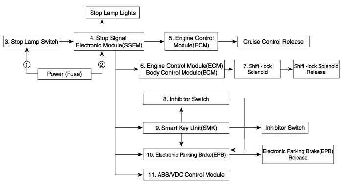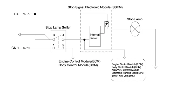 Description The stop lamp switch plays the role of supplying signals to turn on stop lamps and convenience devices (HECU, ECU, BCM, SML, etc.). The stop lamp switch is a system for drivers to express their intention to the brake by press the brake pedal.
