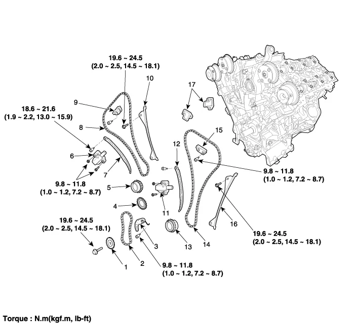 | 1. Oil pump sprocket 2. Oil pump chain 3. Oil pump tensioner assembly 4. Crankshaft oil pump sprocket 5. Crankshaft RH chain sprocket 6. RH timing chain auto tensioner | 7. RH timing chain tensioner arm 8. RH timing chain 9. RH cam to cam guide 10. RH timing chain guide 11. LH timing chain auto tensioner 12. LH timing chain tensioner arm | 13. Crankshaft LH chain sprocket 14. LH timing chain 15. LH cam to cam guide 16. LH timing chain guide 17. tensioner adapter |