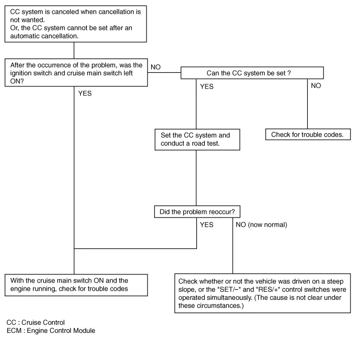 | The CC system is not canceled when the brake pedal is depressed | Damaged or disconnected wiring of the brake pedal switch | Repair the harness or replace the brake pedal switch |